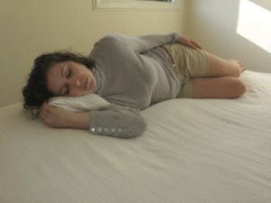 When side sleeping, hug a large pillow and put a pillow between your knees–or use a body pillow. Also, make sure your head pillow is tall enough. It should be about 5 inches (for most people) when compressed–your head should not be pushed up or down but paralell with the bed.